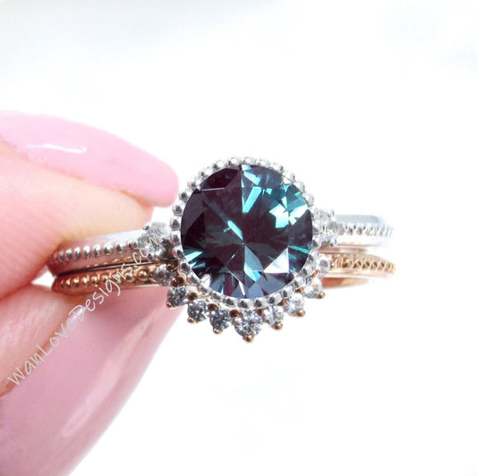 Vintage Alexandrite Engagement Ring Art Deco rose gold Round Migrain Bezel Bridal set Curved Diamond wedding band Anniversary promise ring