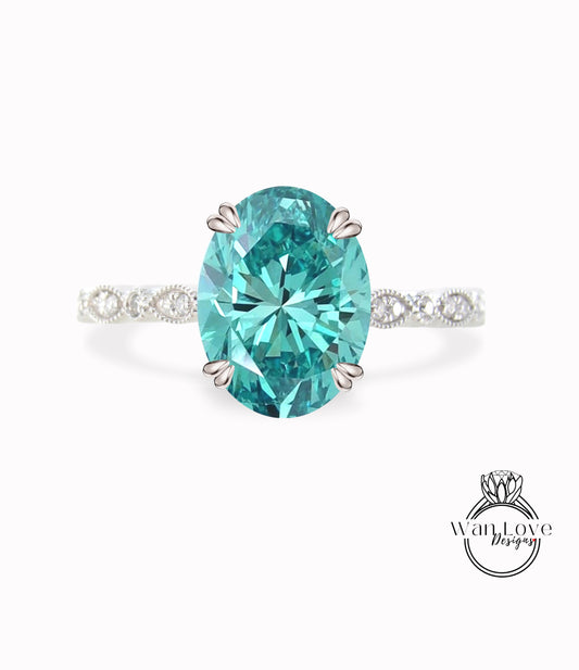 Vintage Blue Moissanite & Diamonds Engagement Wedding Rings, Art deco milgrain 14K 18K Rose Gold Oval moissanite diamond halo bridal ring