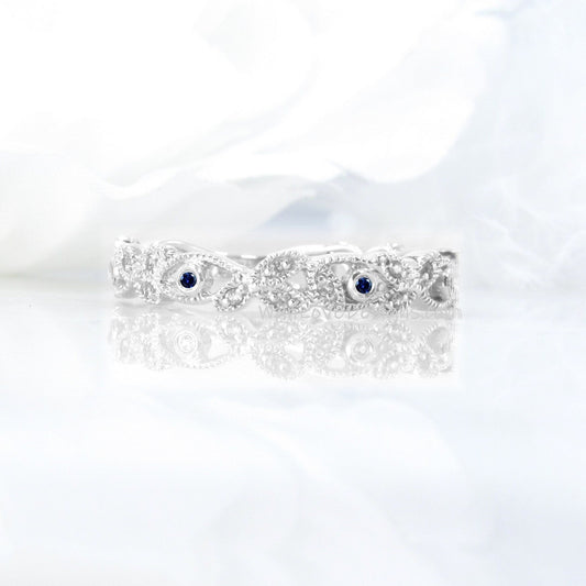 Vintage Blue Sapphire wedding band gold ring antique Unique Art deco Almost eternity band Bridal ring Delicate Stacking Promise swirl band