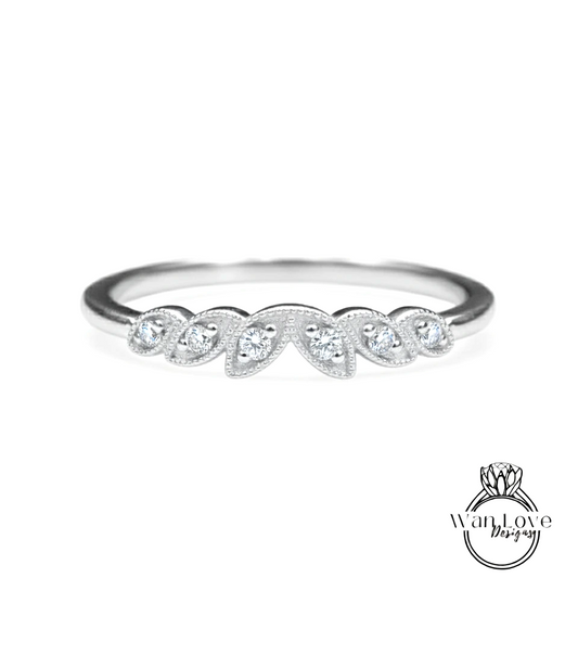 Vintage curved leaf ring, diamonds milgrain engraved antique band, womans curve moissanite ring, unique wedding ring, Birthstone Choice ring