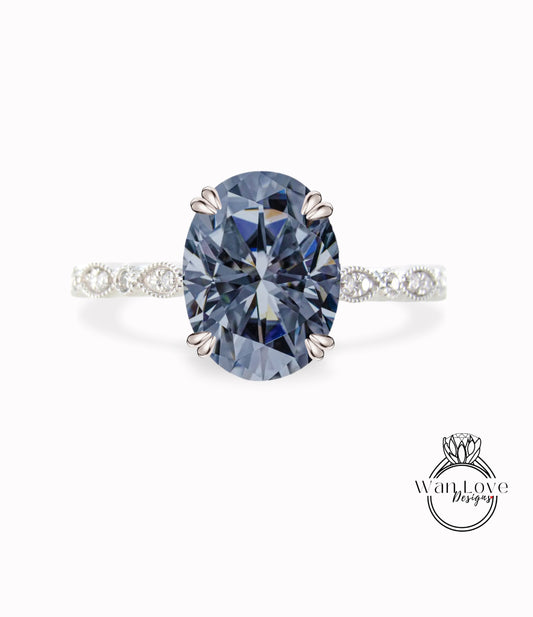 Vintage Grey Moissanite & Diamonds Engagement Wedding Rings, Art deco milgrain 14K 18K Rose Gold Oval moissanite diamond halo bridal ring