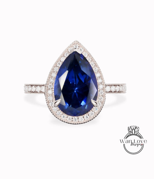 Vintage engagement ring Blue Sapphire ring rose gold Pear cut diamond ring milgrain halo art deco ring wedding Anniversary ring bridal ring