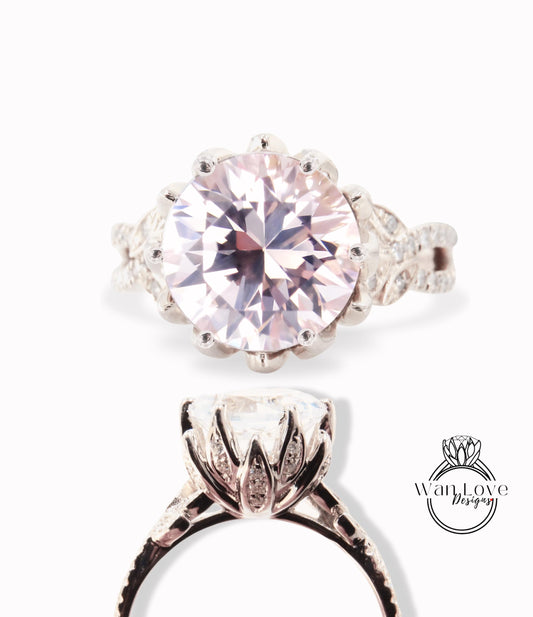 Vintage Light Pink Sapphire diamond engagement ring Lotus leaf flower ring Split Shank ring Rose Gold prong set unique anniversary ring