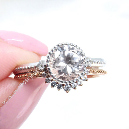 Vintage Light Pink Sapphire Engagement Ring Art Deco rose gold Round Migrain Bezel Bridal set Curved Diamond wedding band Anniversary ring
