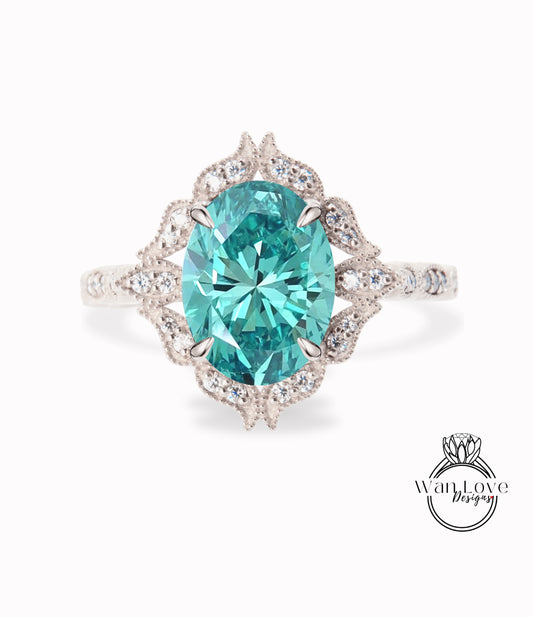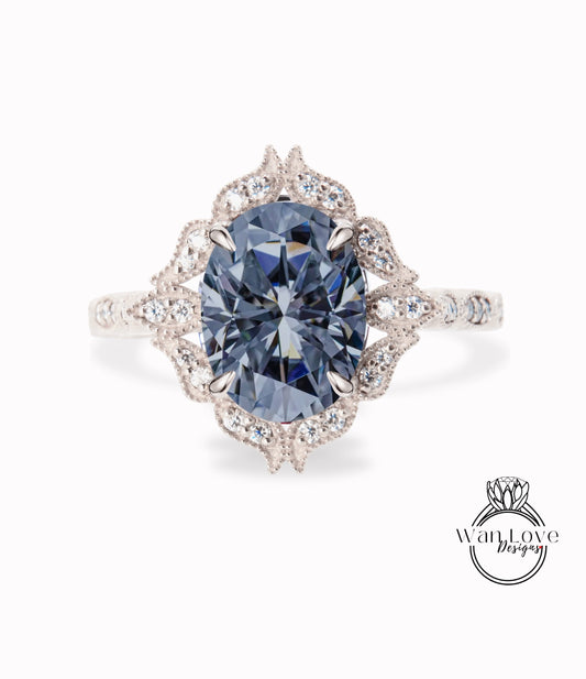 Vintage milgrain Diamond Halo Ring blue Moissanite Diamond Oval Halo Engagement Ring Art Deco Diamond Halo Ring wedding bridal promise ring