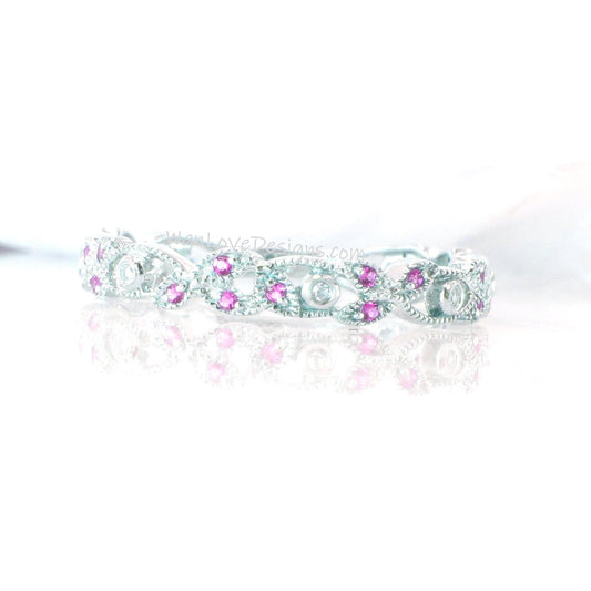 Antique Ruby Leaf Ring, Diamond Anniversary Ring, Ruby and Diamond Anniversary Ring, Birthstone and Diamond Wedding Band, Wedding Band hers