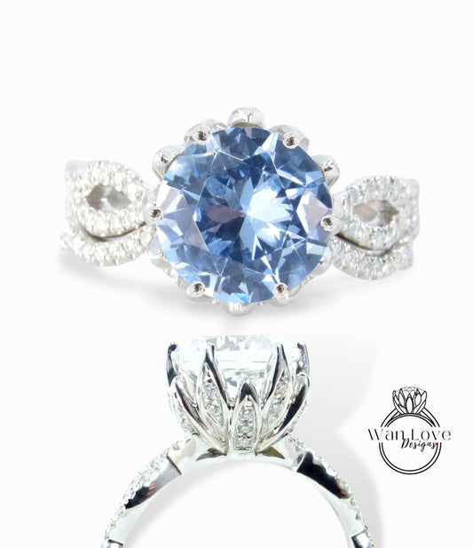 Aquamarine Blue Spinel & Diamond Lotus Flower Engagement Ring, Round, Custom, 14k 18k Rose White Yellow Gold, Platinum