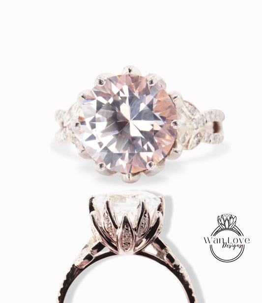 Vintage Peach Sapphire & Diamond engagement ring Lotus leaf flower ring Split Shank ring Rose Gold prong set unique anniversary ring