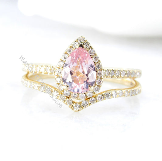 Vintage Pear Peach Sapphire engagement ring set Rose gold Diamond/Moissanite Curved wedding band half eternity Bridal set Anniversary ring