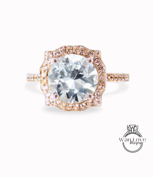 White Sapphire & Diamond Antique Bezel Frame Engagement Ring Art Deco Geometric Halo Vintage Round 14k 18k White Yellow Rose Gold Bridal Proposal Wedding ring Anniversary Gift