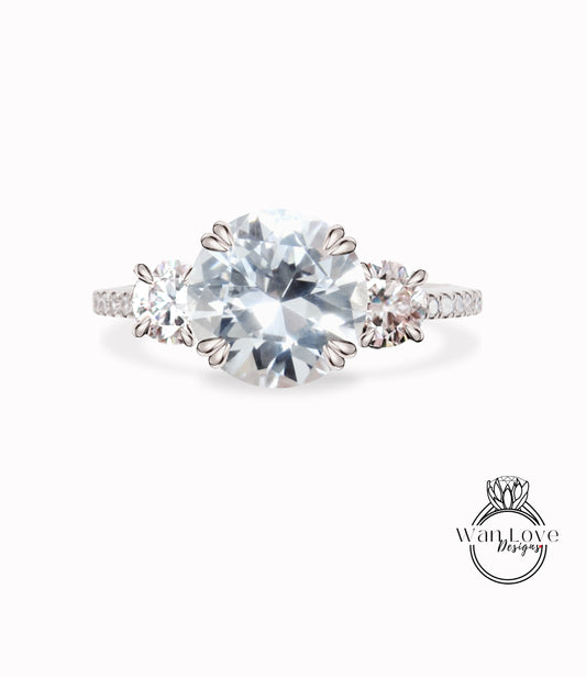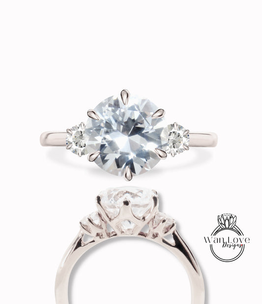 White Sapphire & Diamond 3 gem Stone Engagement Ring Round three gemstone ring 14k 18k White Yellow Rose Gold Platinum-Custom-Wedding Anniversary Gift