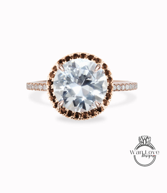 White Sapphire & Black Diamonds Halo Engagement Ring Round 14k 18k White Yellow Rose Gold Platinum Custom made Wedding Anniversary Gift