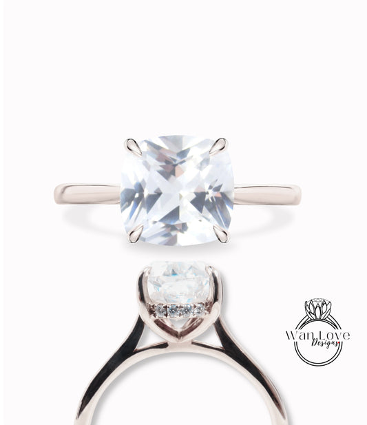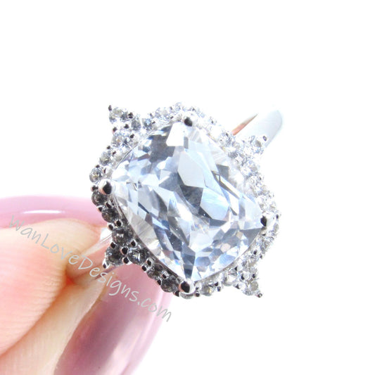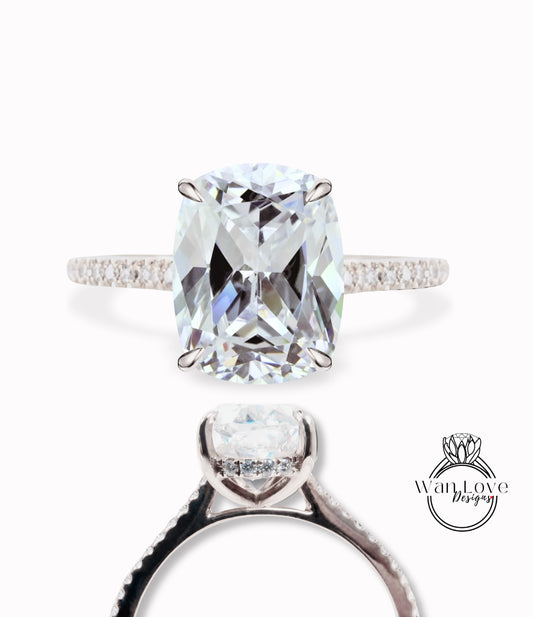 White Sapphire & Diamond Elongated Cushion NSEW prongs Engagement Ring Celebrity style Custom Bridal Wedding ring, Anniversary Gift