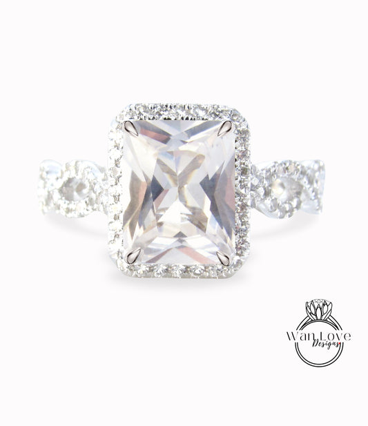 White Sapphire & Diamond Emerald cut Halo Twisted Engagement Ring Split Shank Infinity Twist Vine ring Bridal wedding ring Anniversary Gift