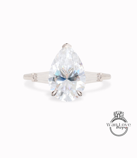 White Sapphire & Diamond Pear Tapered Baguette 3 gem stone Art Deco Moissanite Diamond Engagement Ring Custom Wedding Bridal Ring Anniversary Gift