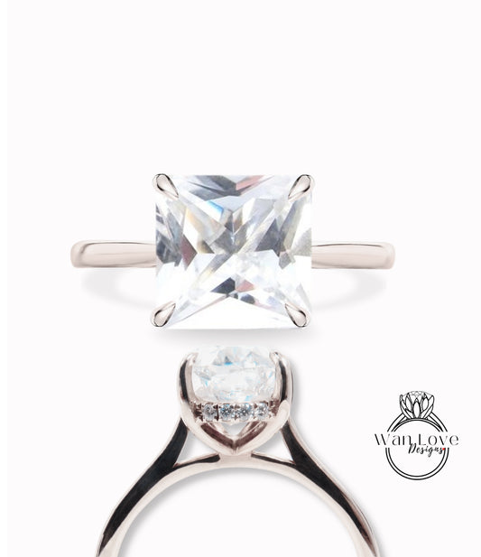 White Sapphire & Diamond Princess side halo plain band Engagement Ring, Cathedral Basket 14kt 18kt Gold-Platinum-Custom-Wedding, Anniversary Gift