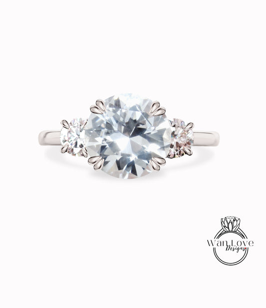 White Sapphire & Diamond round 3 Gem stone Engagement Ring 14k 18k White Yellow Rose Gold-Platinum-Custom three gemstone moissanite diamond bridal wedding ring Anniversary Gift