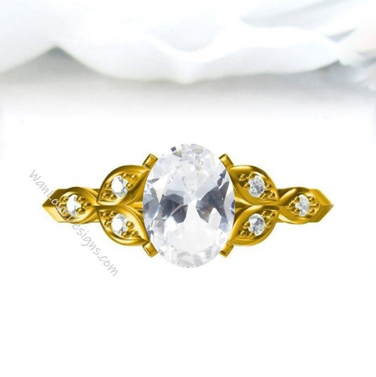 White Sapphire & Diamond Oval Milgrain Engagement Ring, 14k 18k White Yellow Rose Gold, Platinum,Custom,Wedding,North Star, WanLoveDesigns