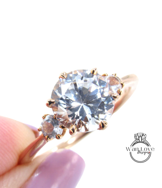White Sapphire 3 Gem Stone Engagement Ring, Trellis, Trinity, Trio, Round cut, 2ct, 8mm, 3mm, Custom made, Wedding, Anniversary Gift,6 prong