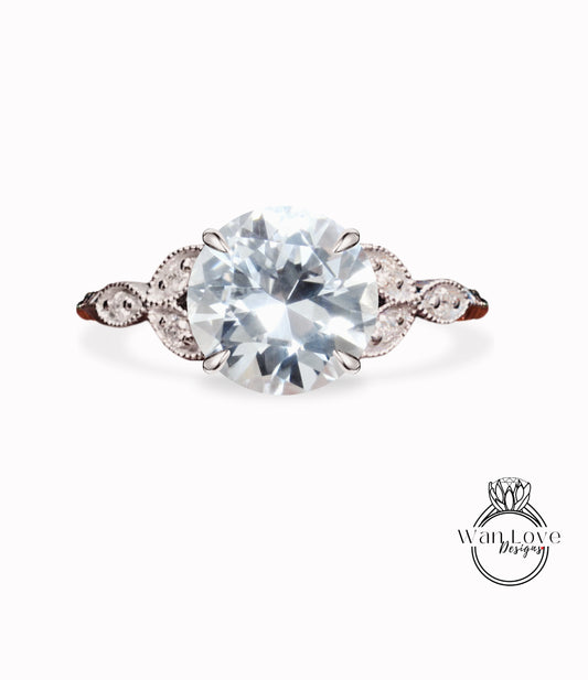 White Sapphire & Diamonds Round Leaf Antique Cluster Engagement Ring Engraved Milgrain or Smooth 14kt 18kt Gold Platinum Custom Wedding