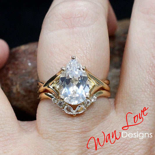 White Sapphire & Moissanite Pear Twist Split Shank Engagement Ring Set, Contoured Wedding Band, Nesting, Curved, Custom, Anniversary Gift