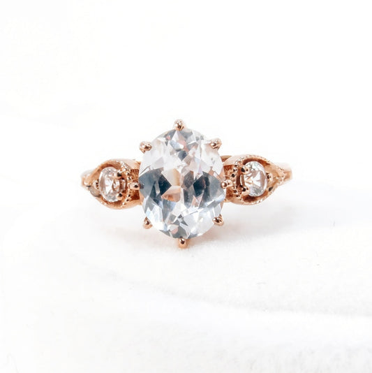 White Sapphire 3 GemStone Oval Engagement Ring 8 prong Milgrain, 3ct 9x7mm, 3mm, Round, Custom, Wedding, Anniversary Gift, Ready to Ship