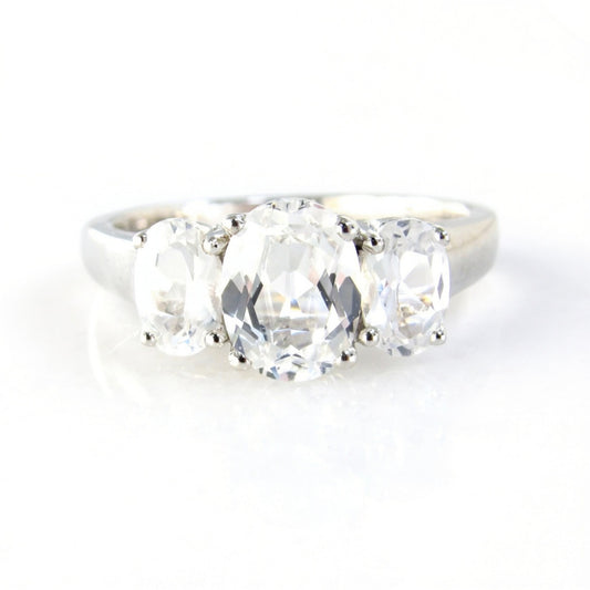 White Sapphire 3 Gem Stone Oval Engagement Ring Gemstone 4ct 10x8mm 1ct 7x5mm 925 Silver w Rhodium-resizable-Ready to Ship