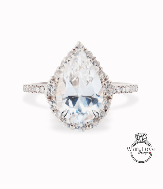White Sapphire Diamond Pear Graduated Halo Engagement Ring, 14k 18k White Yellow Rose Gold-Platinum-Custom-Wedding