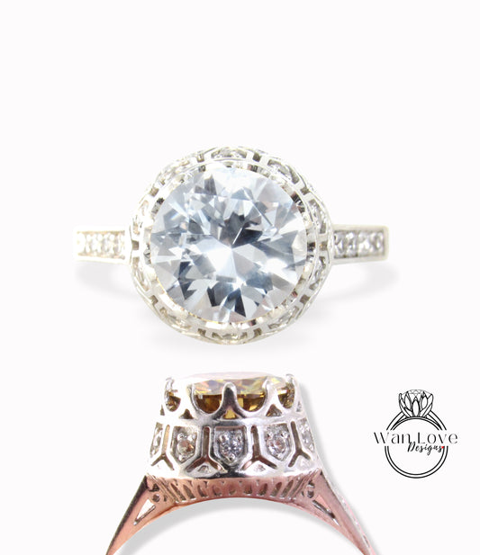 White Sapphire Diamonds Antique Vintage Style Crown Royalty Filigree Engagement Ring 2ct 8mm Custom Wedding Anniversary Gift