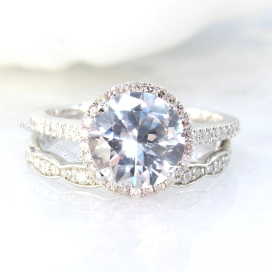 White Sapphire Diamond Oval Engagement Ring Set,Eternity Leaf Milgrain Wedding Band, Custom-14k 18k White-Yellow-Rose Gold-Platinum