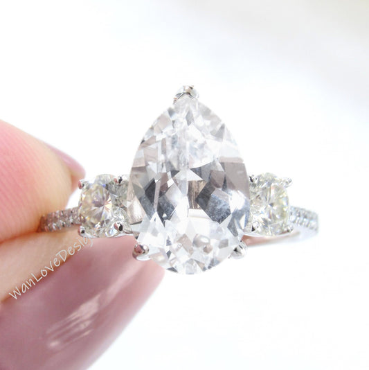 White Sapphire Diamond Moissanite Pear Round 3 Stone Minimalist Dainty Engagement Ring Wedding Anniversary Gift