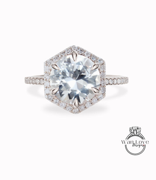 White Sapphire engagement ring hexagon cut Round Sapphire ring 14k rose gold diamond halo half eternity unique ring Promise Bridal ring