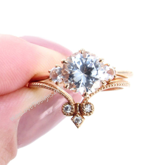 White Sapphire Engagement Ring Set Milgrain Fleur de Lis Contoured V Wedding Band Round 2ct Custom Rose Gold-Ready to Ship