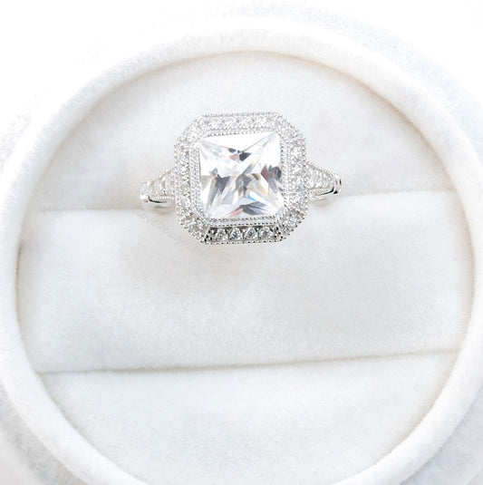 White Sapphire Emerald Milgrain Bezel Princess Round Halo Engagement Ring Antique Moissanite Custom Wedding