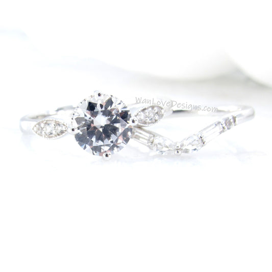 White Sapphire Engagement Ring Set curved matching Baguette Pear Round Wedding Band 1.5ct round sapphire White Gold bridal ring set-Ready