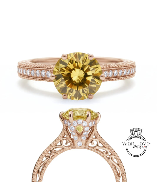 Yellow Sapphire & Diamonds Round Beaded Milgrain Engagement Ring unique vintage filigree Rose Gold Anniversary Gift antique wedding bridal ring