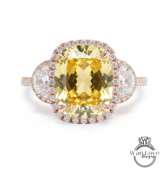 Yellow Sapphire Elongated Long Cushion Triple Diamond Halo Engagement Ring 3 Gem Stone Half Moon Moissanite Diamond 14k 18k Rose White Yellow gold Platinum Anniversary Gift