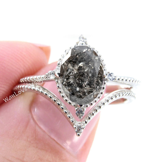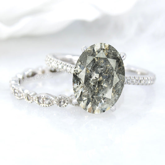 14K Solid Gold Wedding Sets /Oval Salt & Pepper Diamond Bridal Sets/ Anniversary Ring/ Diamond Vintage Band/ Rose Gold Ring Sets