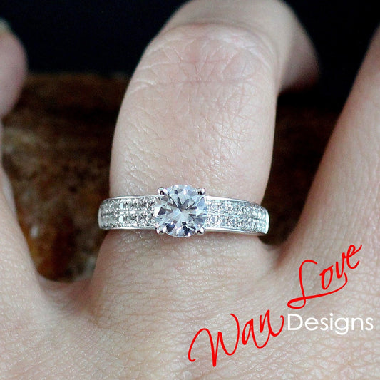 1CT Round Cut White Sapphire Engagement Ring, 2 row Pave Set Band, White Sapphire ring, Round Bridal Ring, Statement Ring, Ready to ship