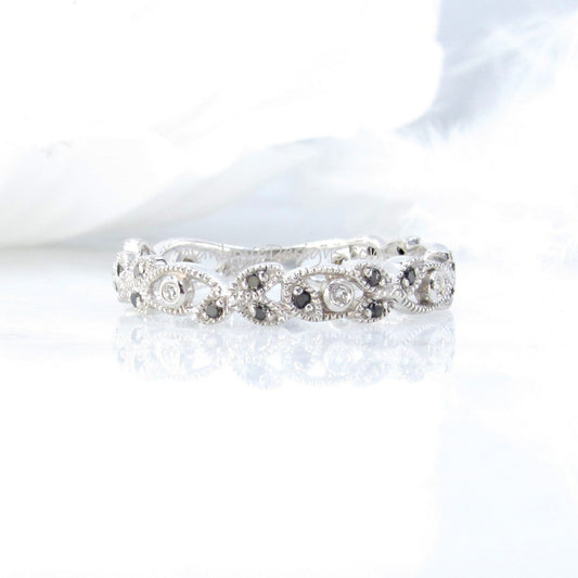 Black & White Diamond Milgrain leaf Eternity Stackable Wedding Band Ring Vintage leaves ring Engagement Anniversary Antique-Ready to ship