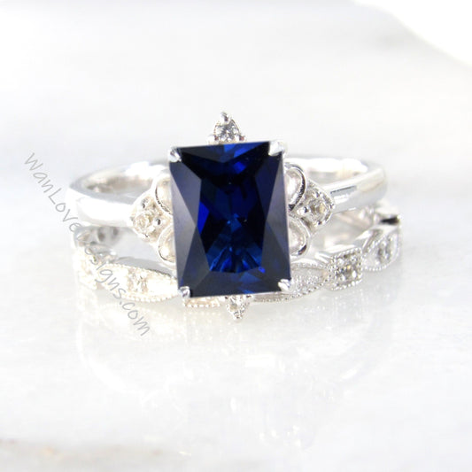 Blue Sapphire & Diamond Emerald Engagement Ring, Wedding Band set, 14k 18k White Yellow Rose Gold-Platinum-Custom-Anniversary