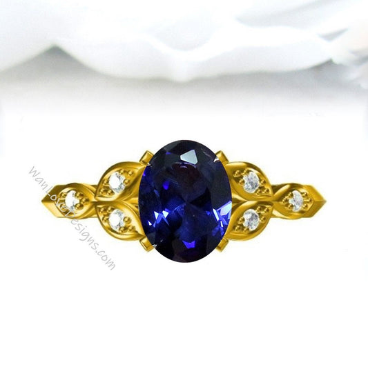 Blue Sapphire & Diamond Oval Milgrain Engagement Ring, 14k 18k White Yellow Rose Gold, Platinum,Custom,Wedding,North Star, WanLoveDesigns