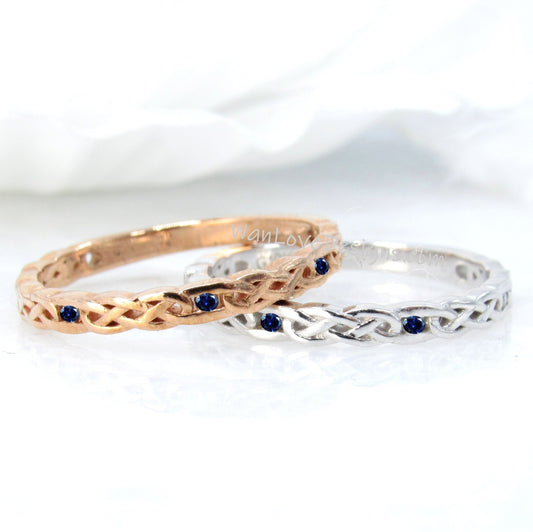 Blue Sapphire Celtic Knot Braided Wedding Ring Almost Eternity Stacking Matching Ring Anniversary Gift For Women 14k Rose Gold Infinity Band