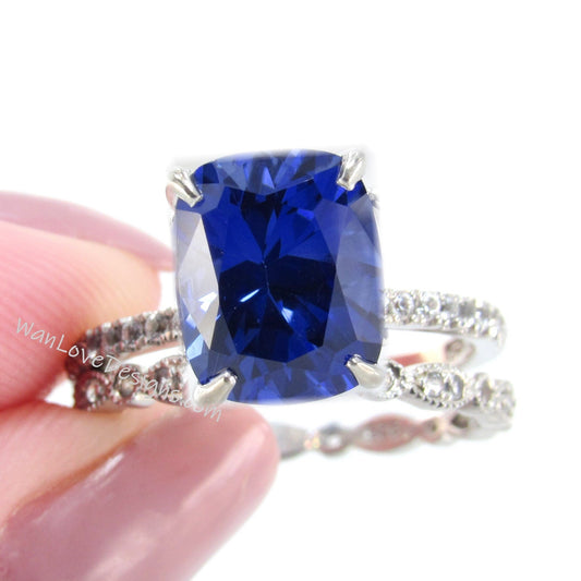 Blue Sapphire Diamond Elongated Cushion Engagement Ring, Eternity Wedding Band Set, Custom-14k 18k White-Yellow-Rose Gold-Platinum