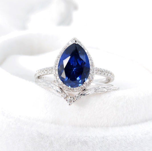 Blue Sapphire Diamond Halo and Curve Band Engagement Ring Set | 14K Gold Nesting Band | Leaves Bridal Ring | Nature Inspired Ring