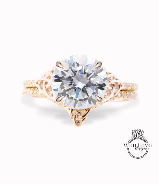 Celtic Knot Moissanite & Diamond Round Engagement Ring Curved Nesting V Chevron Wedding Band Set, Custom, 14k 18k Gold, Platinum