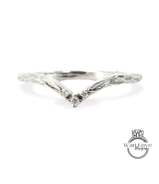 Curved leaf V Chevron Moissanite wedding band, Moissanite diamond leaves twig ring, Bridal wedding ring, nature leaf contour wedding band, Anniversary Gift