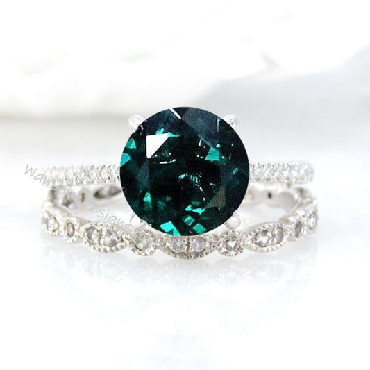 Emerald & Diamond Side Halo Engagement Ring Set Almost Eternity 3 sided shank Celebrity Style Bridal Wedding Band Ring set Custom Anniversary Gift