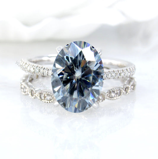 Gray Moissanite & Diamond Oval Leaf Antique Scalloped Engagement Ring Wedding Band set 14k 18k White Yellow Rose Gold Platinum Custom