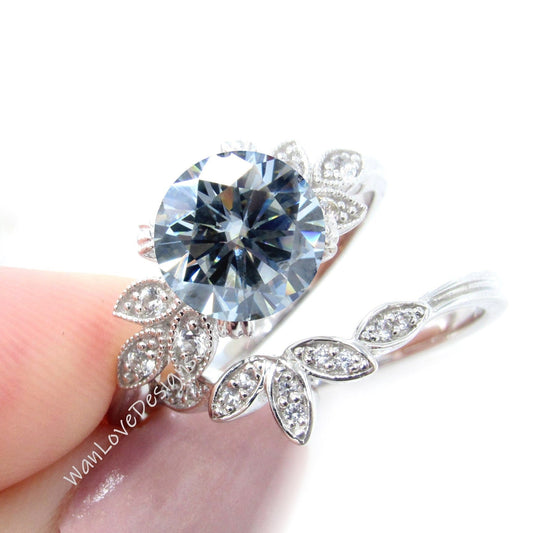 Gray Moissanite engagement ring set white gold Unique Round cut Cluster Diamond milgrain leaf women vintage wedding band Anniversary set